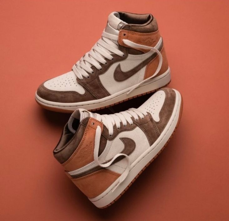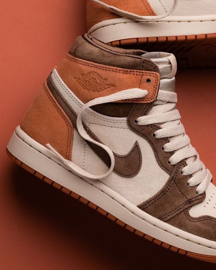 The Air Jordan 1 Retro High OG ‘Dusted Clay’ dons a supple suede upper, featuring a light tan base with brown forefoot overlays and a color-matched Swoosh. A contrasting burnt orange hue lands on the heel and collar flap, marked with a debossed Wings logo on the lateral side. A vintage off-white finish is applied to the midsole, fitted with Air-sole cushioning in the heel and supported by a grippy orange rubber outsole